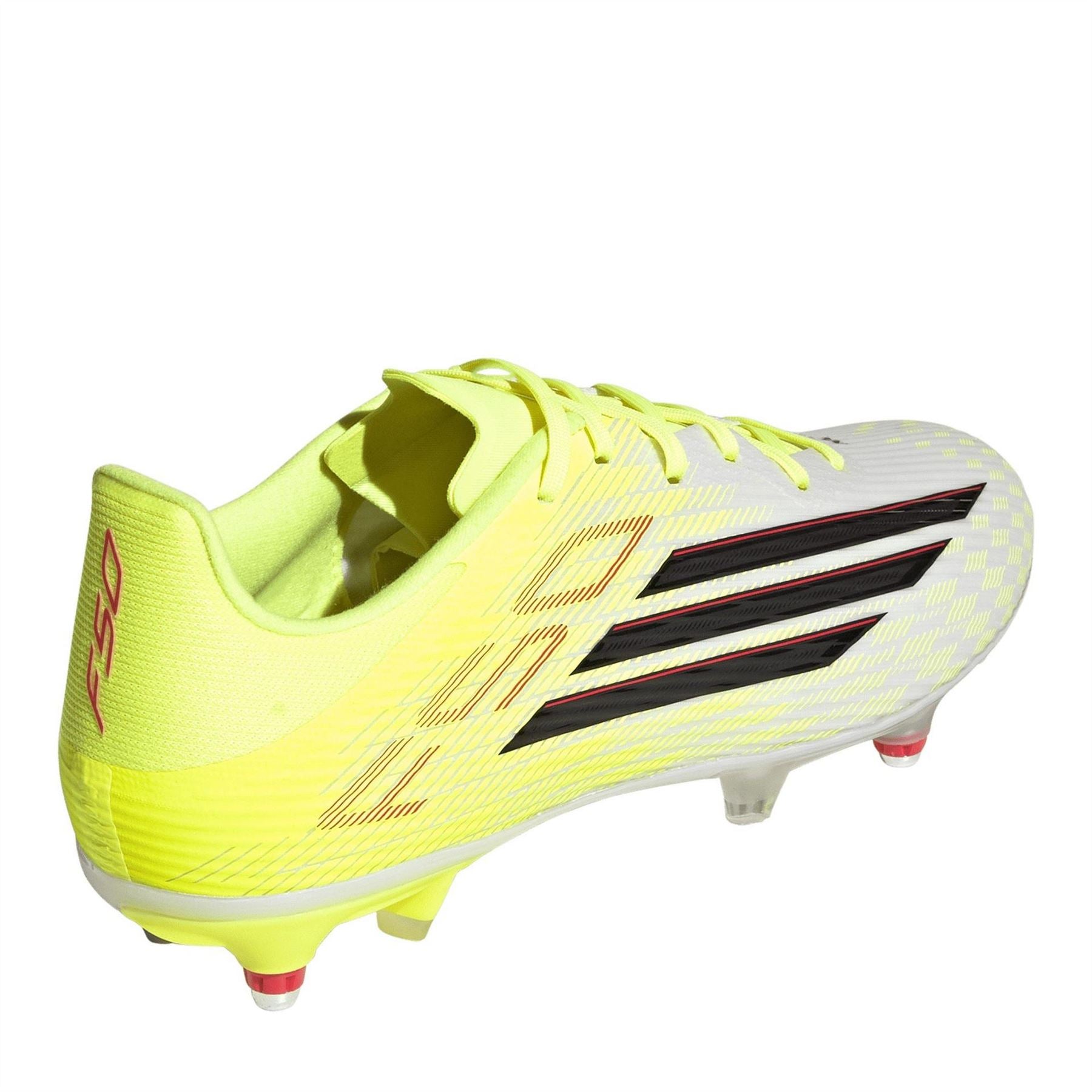 The adidas F50 League Soft Ground boots are engineered for players who refuse to slow down when the pitch gets heavy. A lightweight, engineered synthetic upper that provides a streamlined fit and a close-to-ball feel. The material is designed to resist water absorption, keeping the boot light even on wet pitches. Product Highlights - A lace-up design for a secure fit - Features a technical textured print in key striking and dribbling zones, enhancing ball control and grip - A specialised soft ground outsole for optimal grip on wet, muddy surfaces