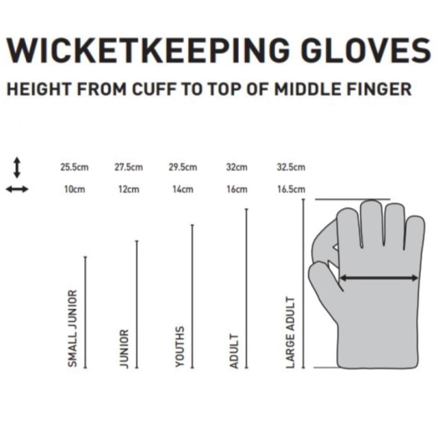 Ideal glove for all School and Club Wicket Keepers. Pimple Rubber Palm Facing gives enhanced grip when catching the ball. PVC Faux Leather back of hand. Breathable Cotton Lining. Cotton Palm Filling for shock absorption. Rubber Thimble for finger/thumb tip protection. Padded Cuffs protect vulnerable wrist area if the ball is not taken cleanly. ‘T’ Web construction between thumb & fore finger conforms to MCC Laws.