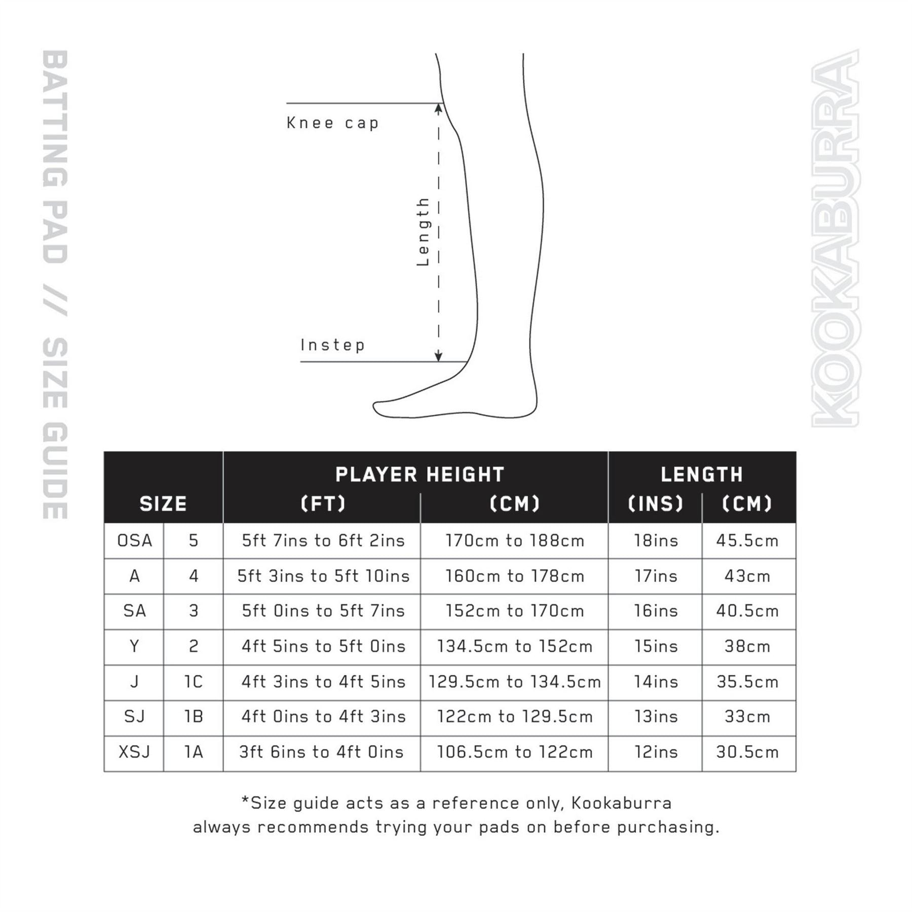 Entry Level Protection, manufactured using durable PVC and Medium-Density Foam DNA • Grade 5 quality Impact Protection – External • Lightweight Cane & Foam rods • Three Piece Knee Roll with ergonomic Bolsters provides enhanced shape retention. Impact Protection – Internal • Duo Flex Knee Roll - Cotton faced. • Tri-Flex Integral Shin Bolster – Cotton faced. Additional Features • Durable ‘Tough Scuff’ Instep Facing • ‘Grain’ PVC Straps • 50mm Calf & 25mm Thigh & Ankle with 25mm Hook & Loop Size J (1C) - Ambidextrous (suitable for Right or Left-Handed Batters) - suitable for Players of heights between 4ft 3ins (130cms) & 4ft 5ins (135cms)