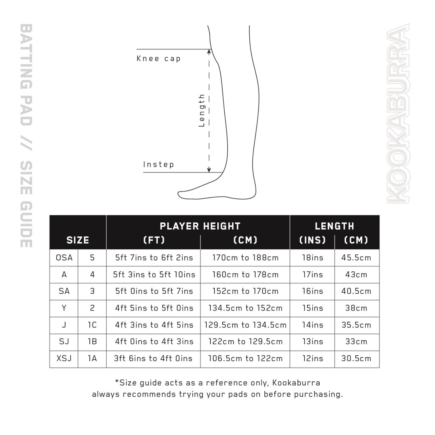 Entry Level Protection, manufactured using durable PVC and Medium-Density Foam DNA • Grade 5 quality Impact Protection – External • Lightweight Cane & Foam rods • Three Piece Knee Roll with ergonomic Bolsters provides enhanced shape retention. Impact Protection – Internal • Duo Flex Knee Roll - Cotton faced. • Tri-Flex Integral Shin Bolster – Cotton faced. Additional Features • Durable ‘Tough Scuff’ Instep Facing • ‘Grain’ PVC Straps • 50mm Calf & 25mm Thigh & Ankle with 25mm Hook & Loop Size A (4) - Ambidextrous (suitable for Right or Left-Handed Batters) – suitable for Players of heights between 5ft 3ins (160cms) & 5ft 10ins (178cms)