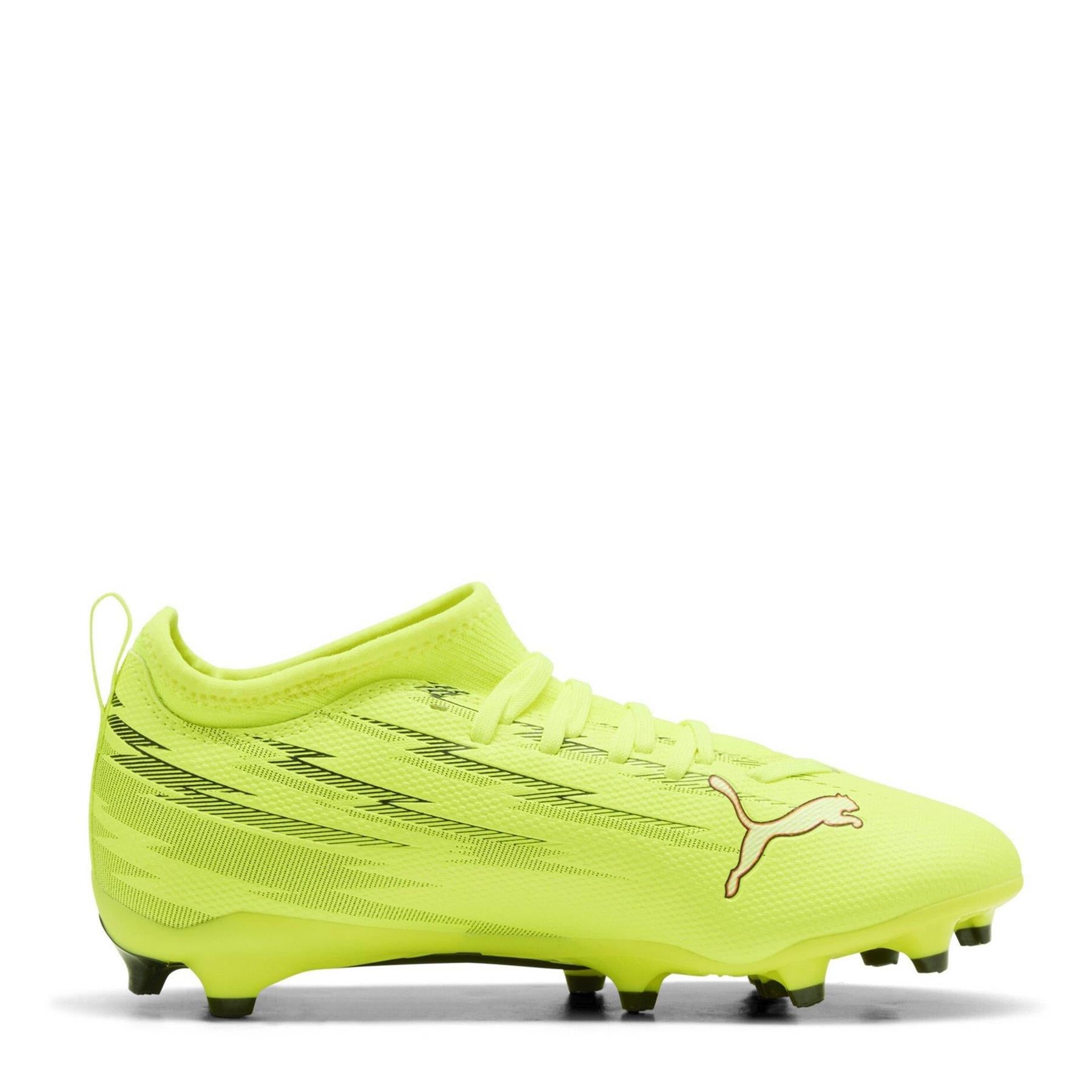 Help young players unlock their speed with the Puma Ultra 5 Match Firm Ground Football Boots. Featuring a lightweight mesh upper with GripControl skin, these boots offer enhanced ball control and a responsive feel during quick play. Perfect for weekend matches, school team games, or training sessions. Product Highlights: - A lace-up design for a secure fit. - The SPEEDSYSTEM outsole enhances traction and energy return. - Composition: Upper: synthetic. Lining: textile. Sole: Inner: textile. Outer: synthetic.