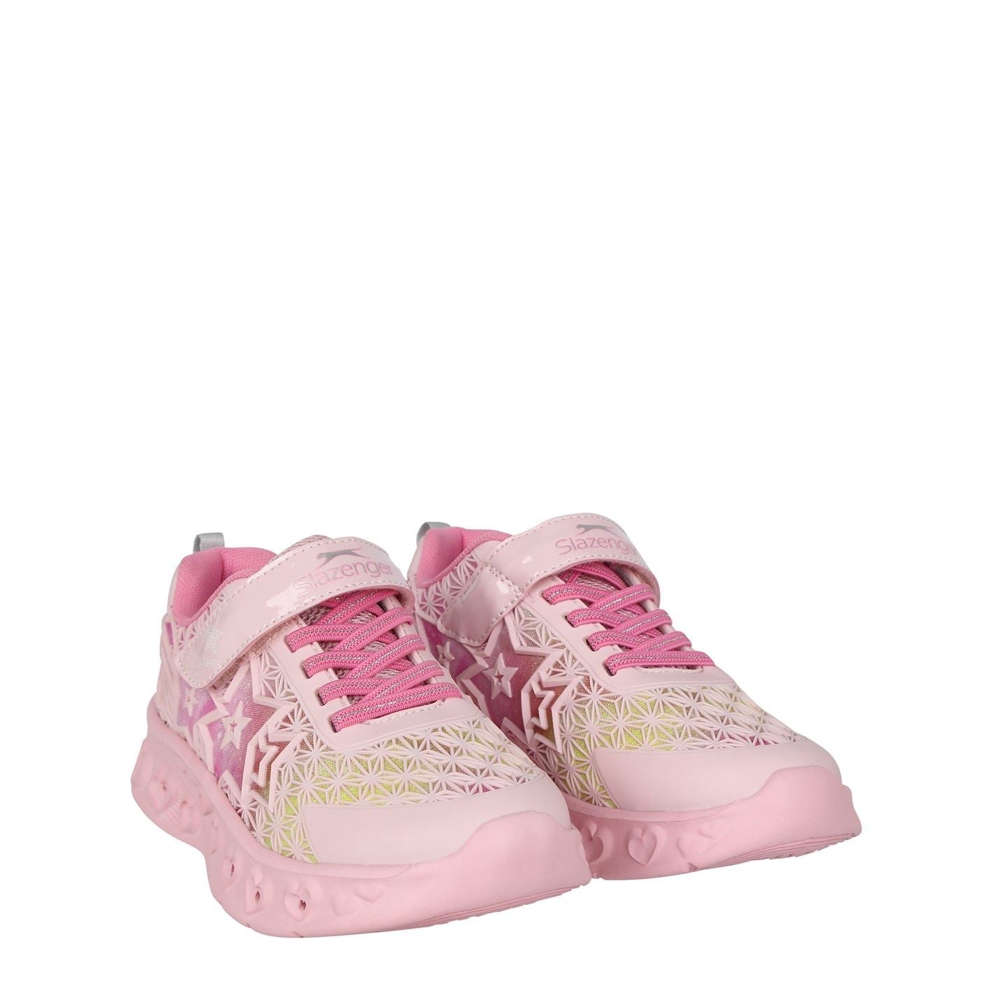 The Slazenger Tilly Child Trainers are perfect for everyday wear, crafted with a shaped ankle collar coupled with elasticated laces, a touch tape fastening and pull loop to the heel allows for an easy on and off as well as a secure fit. A lightweight moulded outsole with lightup detail, that can be switched on and off. 3D application on the upper gives a stylish look, finished off with the classic Slazenger branding.
