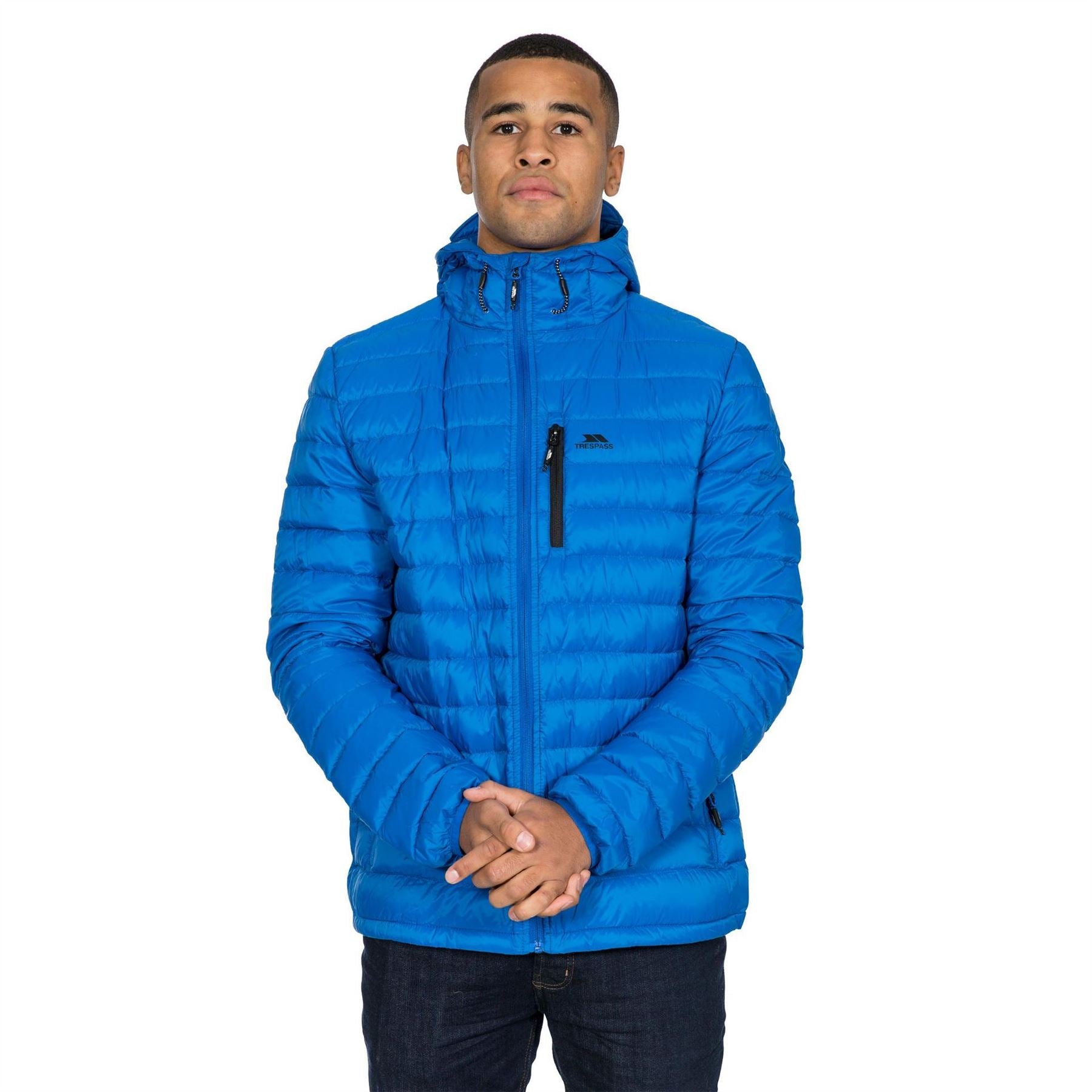 Trespass down jacket features a hooded neckline and a regular fit, offering warmth and comfort. The jacket includes a zipper closure and elasticated cuffs for a secure fit. It has a straight hem and a solid pattern, complemented by a logo and a chest pocket for added functionality.