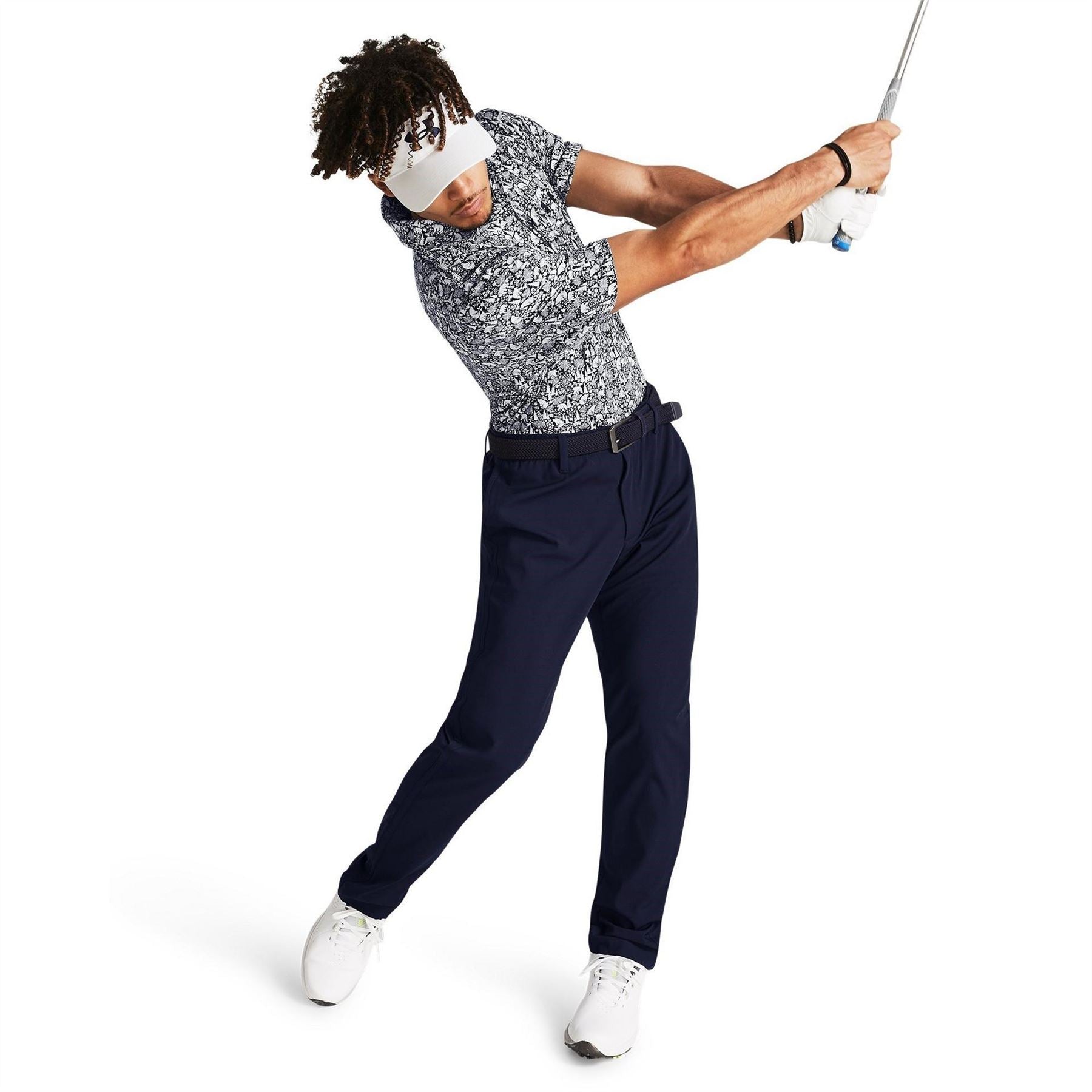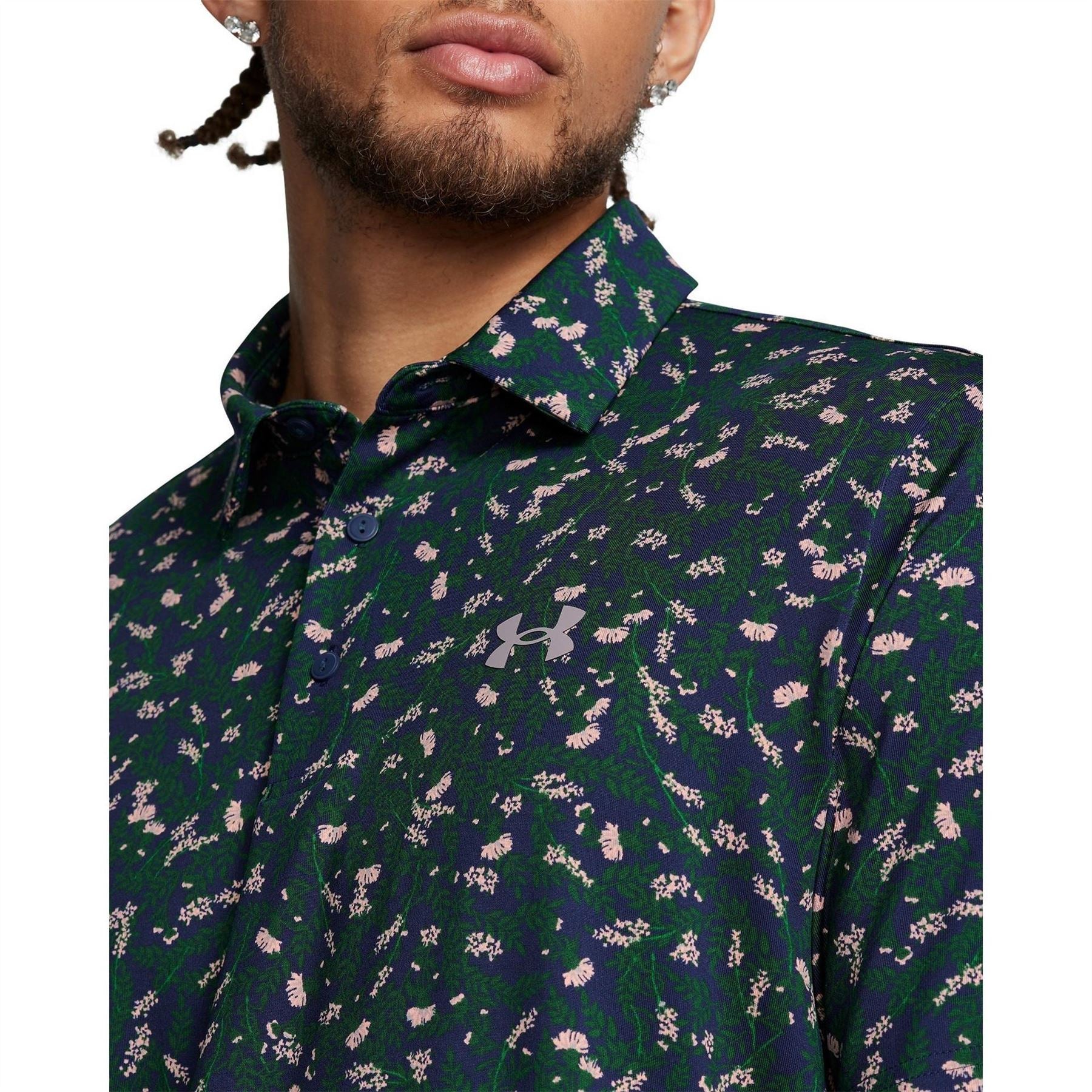 This Under Armour top is designed for activewear enthusiasts. Featuring a geometric pattern, it offers a regular fit with short sleeves and a polo collar. The button closure adds a touch of practicality, while the logo embellishment highlights the brand's identity. Ideal for performance activities, this top combines style and functionality seamlessly.